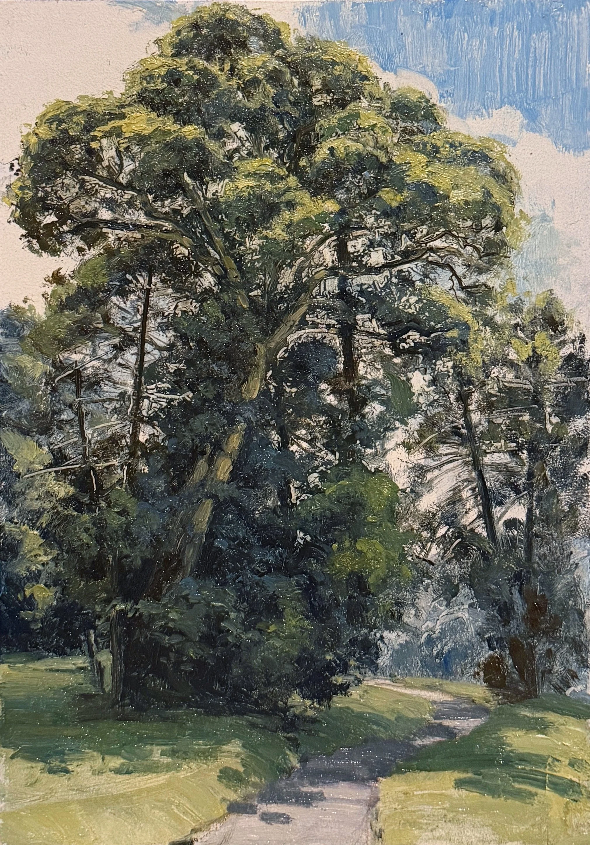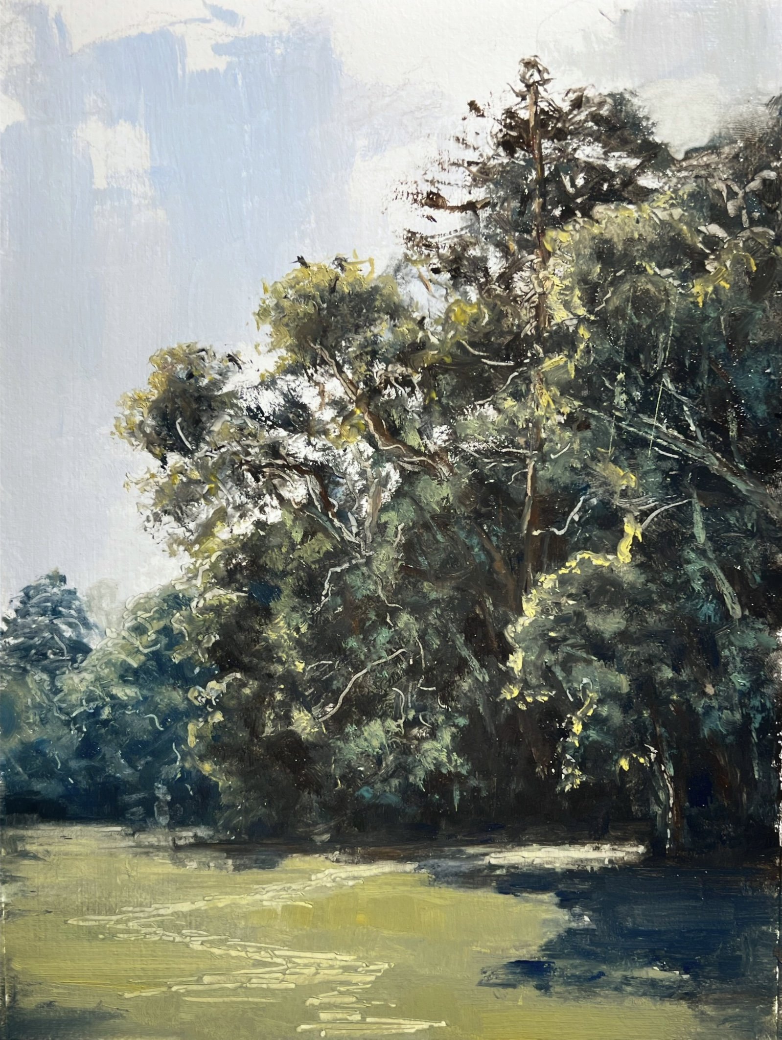 A vertical study of the eucalypt canopy, painted quickly in response to the bright breaks of light through foliage.