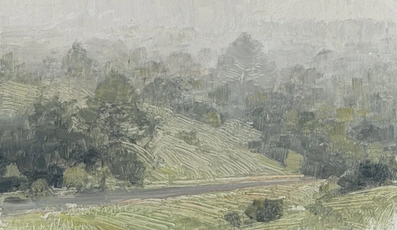 A small plein air study painted on location in the Bunya Mountains, focused on the muted greens and soft atmosphere of the range on an overcast morning.
