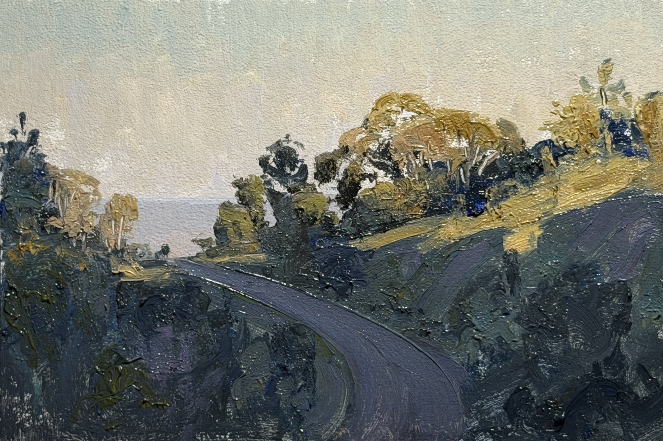 Last Light on the Ridge follows the road as it curves into the depths catching a brief warmth across the hillside and the deep greens of the bush beyond. A quiet field painting shaped by distance, weather, and the slowing light of late afternoon.